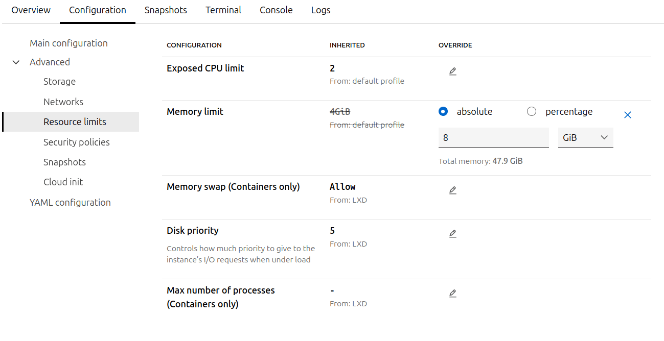 Use the lxc config set command to update instance options. Specify the instance name and the key and value of the instance option: